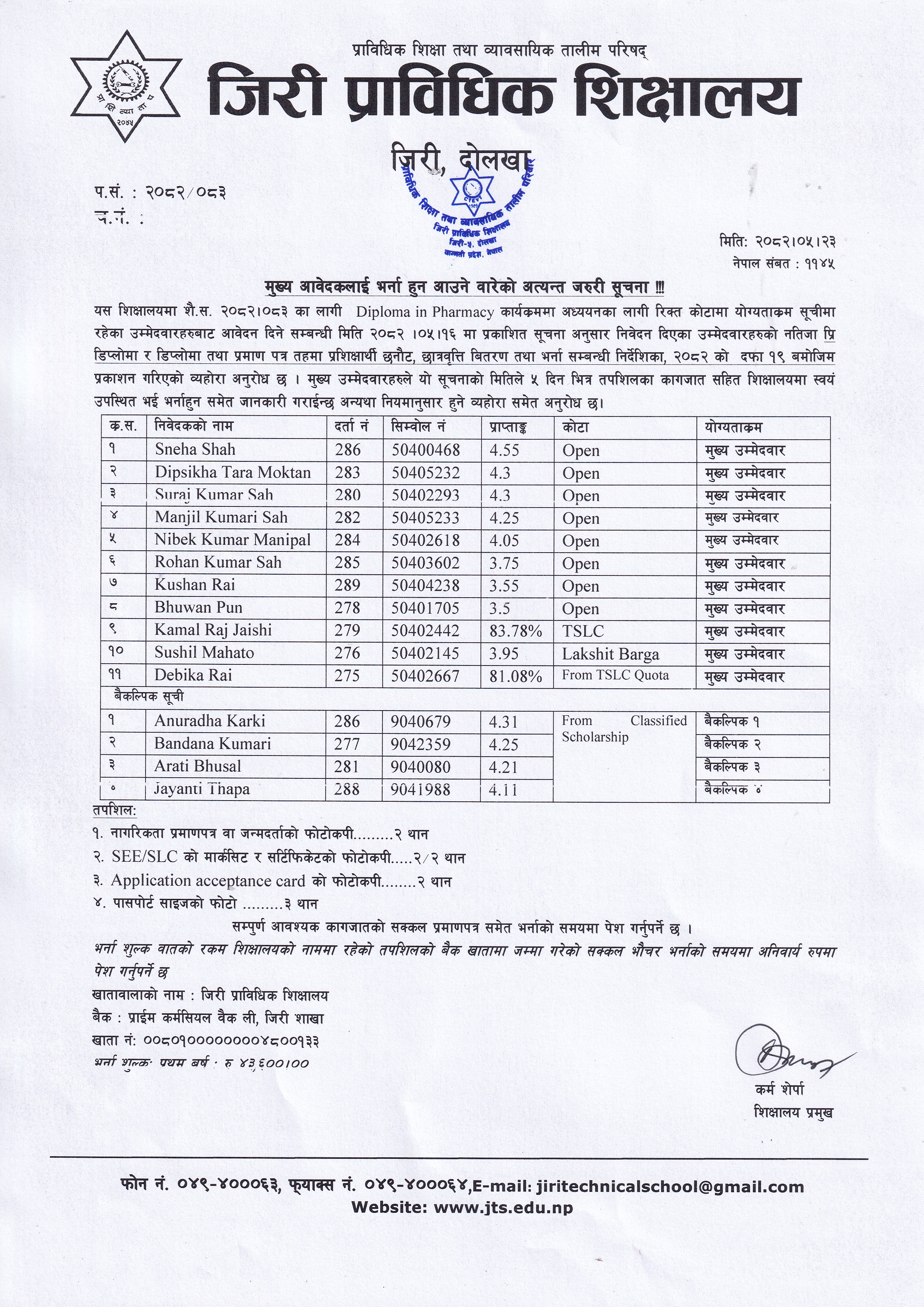डिप्लोमा फार्मेसी तहमा बैकल्पिक उम्मेदवारको नतिजा प्रकाशन र भर्ना सम्बन्धी जरुरी सूचना